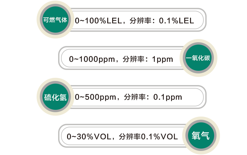 可燃氣體0~100%LEL,分辨率0.1%LEL; 甲烷:0~5%VOL,分辨率0.01%VOL; 氧氣:0~30%VOL,分辨率0.1%VOL; 一氧化碳0~1000ppm,分辨率1ppm; 硫化氫0~500ppm,分辨率0.1ppm |